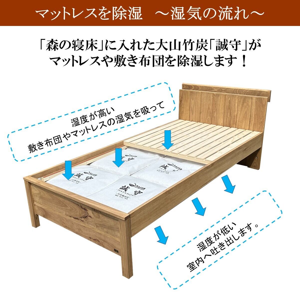 無垢で作ったベッドフレームには、木炭の約5倍の調湿能力をもつ竹炭を敷き詰め、乗せる低反発マットレスが湿気で蒸れる欠点を竹炭の調湿能力により解決。