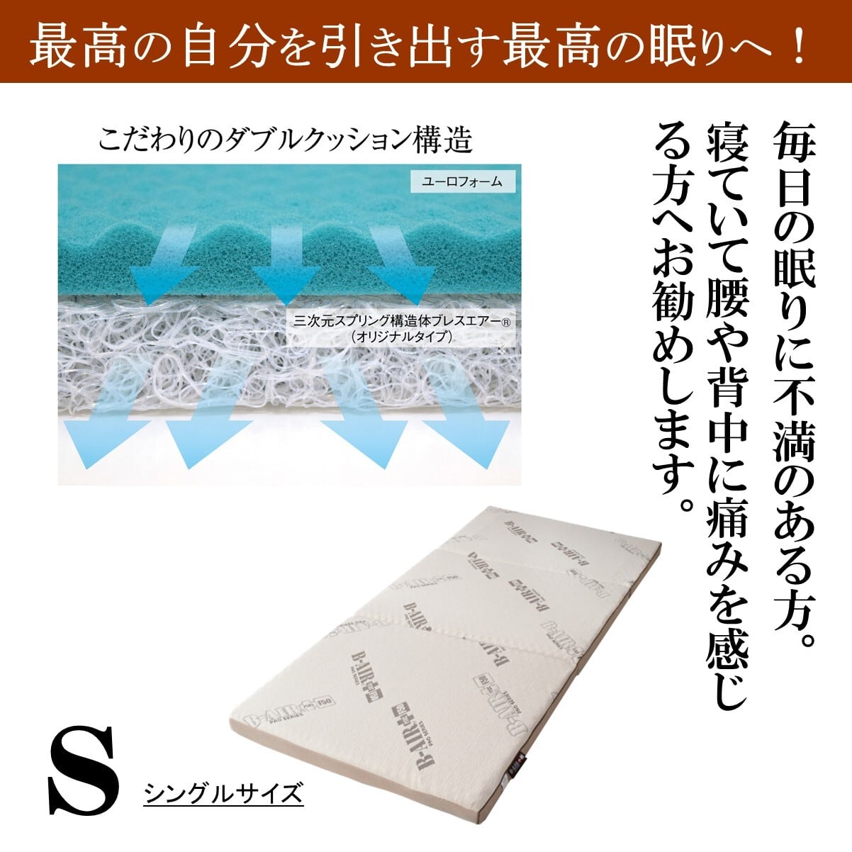 厳選されたヨーロッパ大手ユーロフォーム社製の高弾発性ウレタンフォーム(ユーロフォーム)と国内大手東洋紡の3次元スプリング構造体ブレスエアー(高密