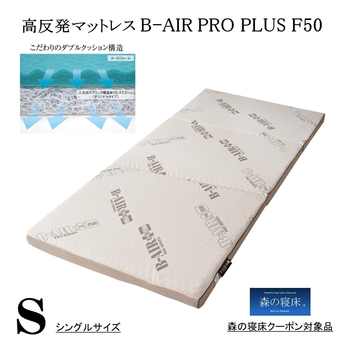 高反発マットレス B−AIR+F50 シングル 薄型 三つ折り しっかりタイプ 洗える敷き布団 ブレスエアー ユーロフォーム 安眠 体圧分散 寝姿勢 腰痛の方におすすめ