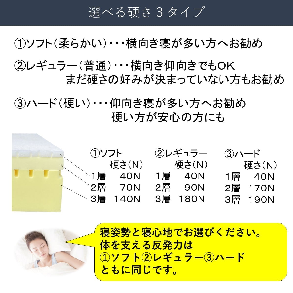 硬さはソフトとレギュラーの2タイプ。横向き寝の方にはソフトを、仰向き寝の方にはレギュラーをそれぞれお勧めいたしますが、身体に合わせた寝心地でお選びください。